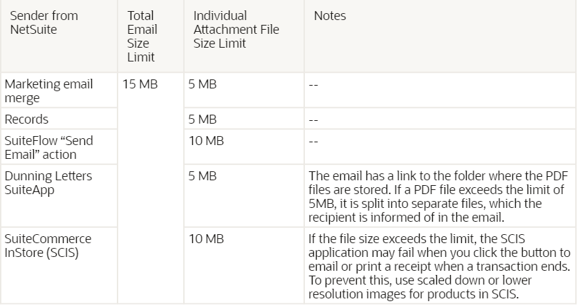 The total email size limit is 15 MB for outbound emails. This limit is for the email message content and all attachments. The limit allows room for the system to add other items required, such as the email header information and message encoding. This means that after the system processes the email to be sent, the resulting email sent from NetSuite may be larger than 15 MB.