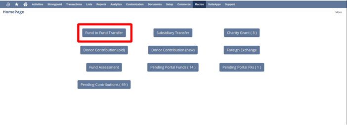 Once logged in the user can choose “Transactions Screens” from the NetSuite Center and access the homepage of the Transaction screen which lists different transaction types. Here choose Fund to Fund Transfer and the user will be redirected to the list page of Fund to Fund transfer.