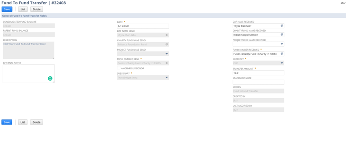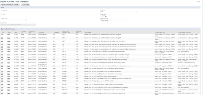 Fund to Fund transfer screens help users to transfer funds between DAF ,and Project Charities Charities in multiple currencies.