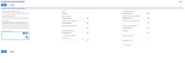 The Create Fund to Fund Transfer screen is used to send funds from one organization to the other. The sender can either be a DAF fund, Charity Fund or Project Charity fund, similarly the receiver can also be DAF , Charity or Project Charity.