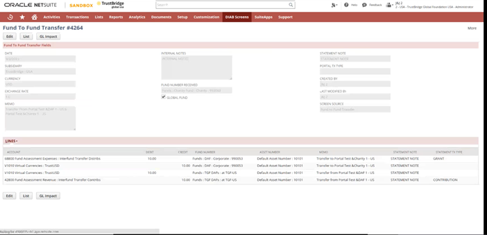 The view screen enables users to gain an understanding of the journal entries made in NetSuite. Details entered and saved by the user in the create and edit screens are further displayed in the view screens. This includes transaction lines which reflect the fund movement from the fund number sent to the Fund number received.