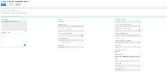 Consolidated Fund Balance : In the Fund balance section, the consolidated Fund Balance field is displayed. This field displays the consolidated balance of the selected Sending fund number. (DAF or charity)