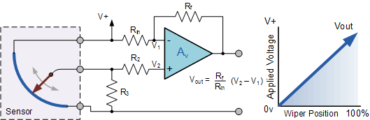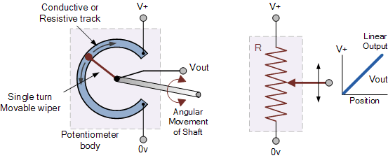 The output signal (Vout) from the potentiometer is taken from the center wiper connection as it moves along the resistive track and is proportional to the angular position of the shaft.