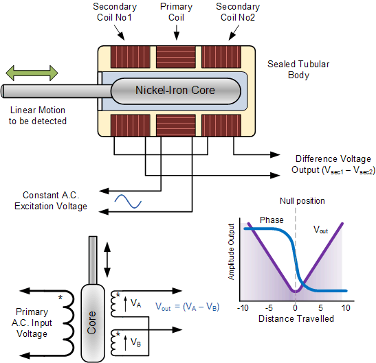 The polarity of the output signal depends upon the direction and displacement of the moving core. The greater the movement of the soft iron core from its central null position the greater will be the resulting output signal. The result is a differential voltage output which varies linearly with the cores position. Therefore, the output signal from this type of position sensor has both an amplitude that is a linear function of the cores displacement and a polarity that indicates direction of movement.
