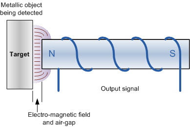When a ferromagnetic material is placed within the eddy current field generated around the inductive sensor, such as a ferromagnetic metal plate or metal screw, the inductance of the coil changes significantly. The proximity sensors detection circuit detects this change producing an output voltage. Therefore, inductive proximity sensors operate under the electrical principle of Faraday’s Law of inductance.