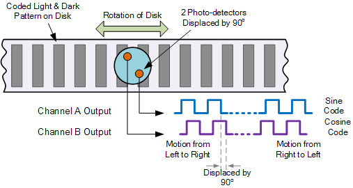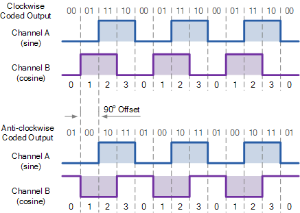 Incremental encoders have two separate outputs called “quadrature outputs”. These two outputs are displaced at 90o out of phase from each other with the direction of rotation of the shaft being determined from the output sequence.