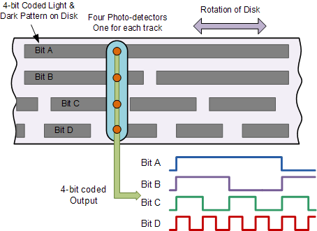 All optical encoders work on the same basic principle. Light from an LED or infra-red-light source is passed through a rotating high-resolution encoded disk that contains the required code patterns, either binary, grey code or BCD. Photo detectors scan the disk as it rotates, and an electronic circuit processes the information into a digital form as a stream of binary output pulses that are fed to counters or controllers which determine the actual angular position of the shaft.