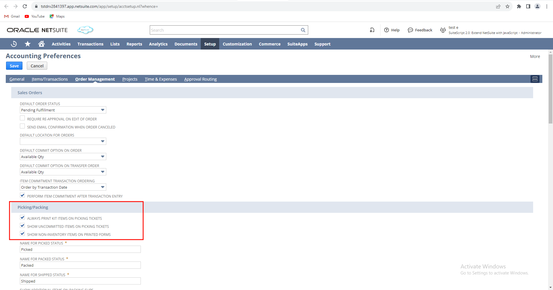 - In Order Management tab -> under the Picking/Packing subtab, check ‘Show uncommitted items on picking tickets’ and ‘Show non-inventory items on printed forms’