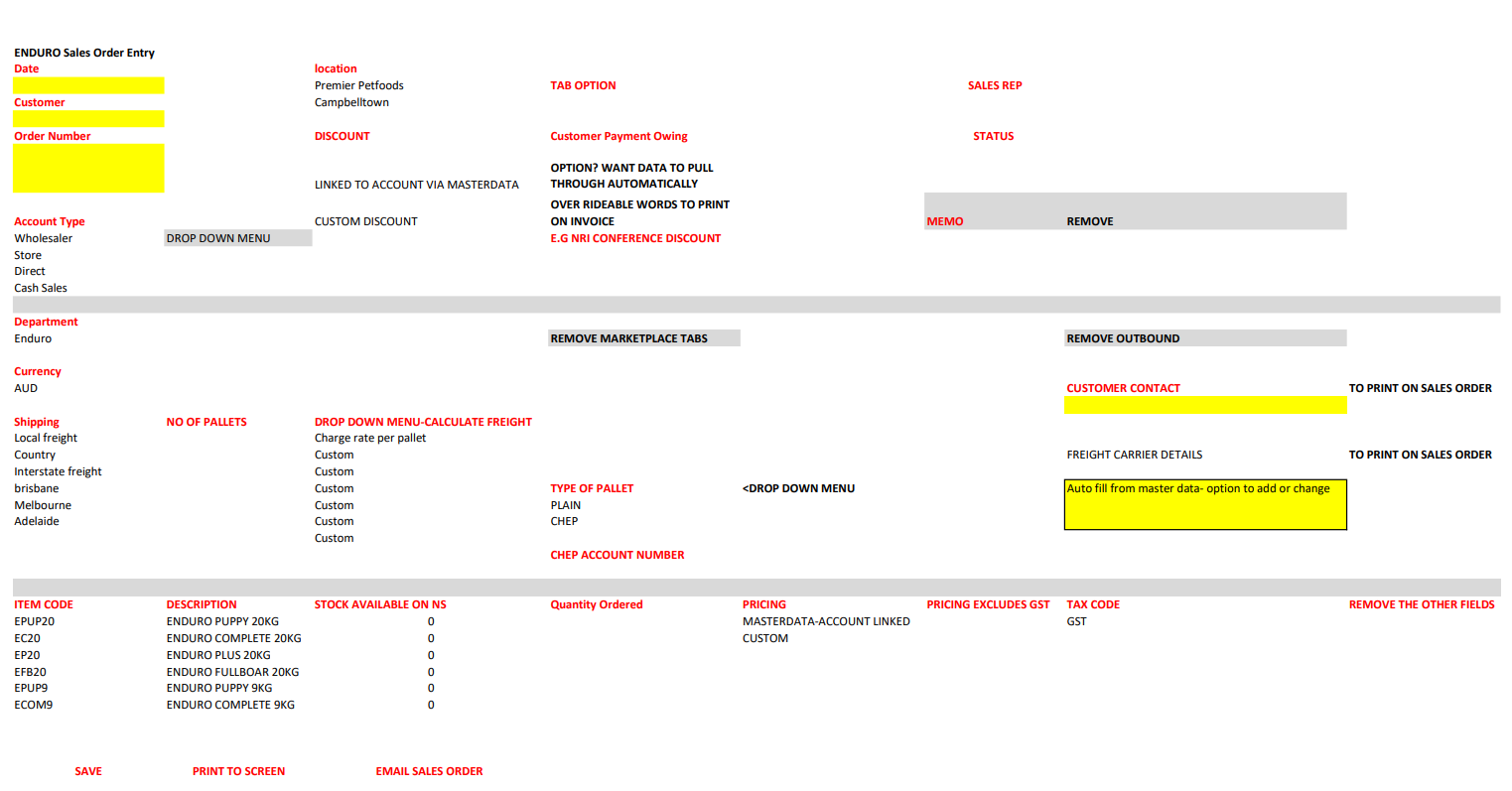 - Create a new sales order form for handling sales order process for Enduro. The new form needs to incorporate additional fields like “Number of pallets,” “Type of pallets,” and “Chep account number,” etc. with the specified input formats such as text fields and dropdown menus.