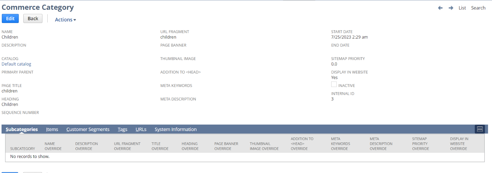 - Method-1: Since we don’t have a commerce category record, we will be creating a custom record that holds the fields as of the normal commerce category, also we will be creating a custom field on the item record to store the associated commerce category (Custom Record), the custom record holds the details of commerce categories which include subcategories, items, URL fragments, Name Description, and Primary Parent. We will be updating the custom field on the item record based on the commerce category that is created using NetSuite scripts, and based on that custom field on the item we will be displaying items accordingly on the UI, a normal record for the commerce category is given below. We will be using saved search for getting the custom commerce category