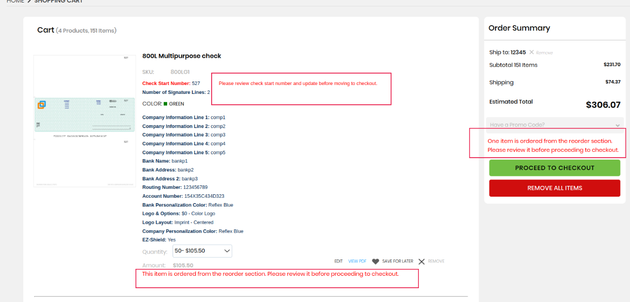 Any personalized check added to the cart through the reorder feature should be flagged or