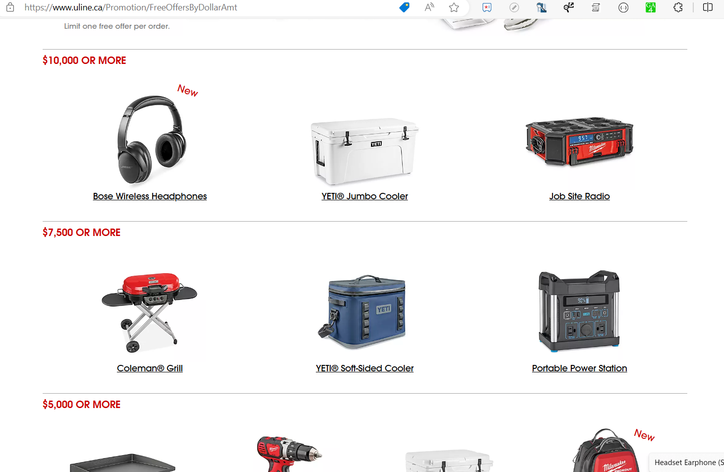 Develop a feature allowing customers to select a free gift when their order total reaches specific thresholds. The feature needs to be like the ULINE free gifts system.