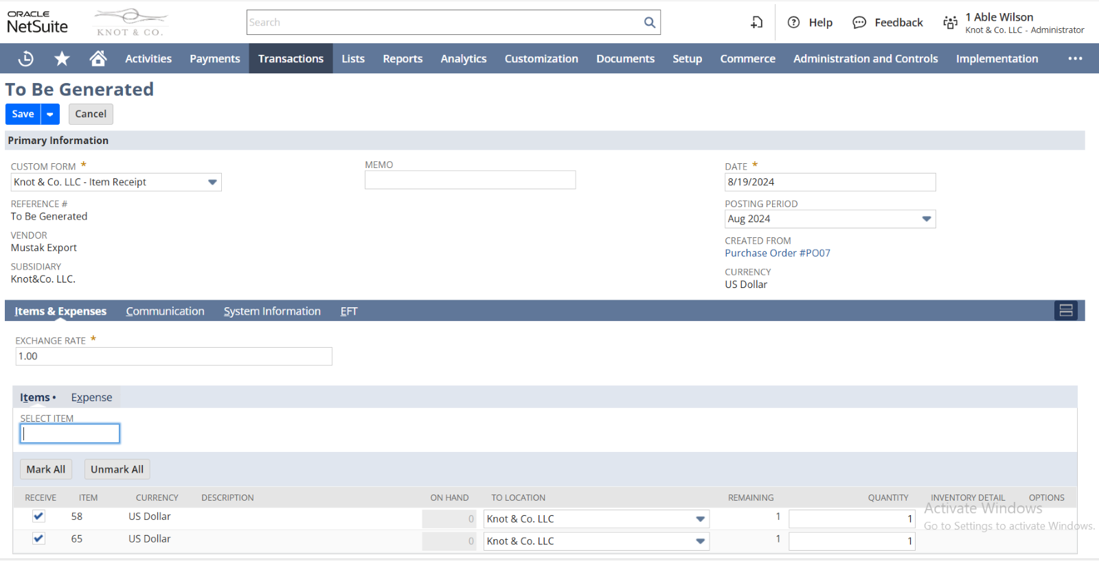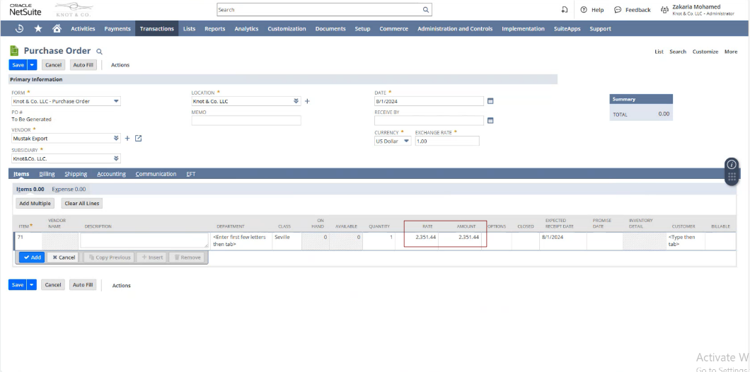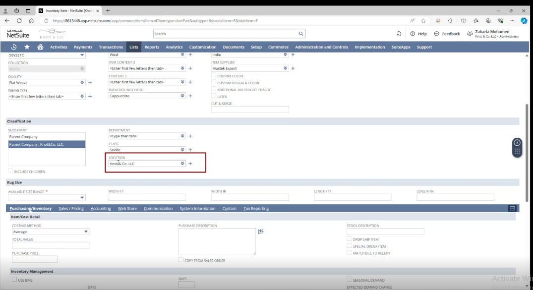 - Default Location: The implementer will default the Value in the Location field as Knot & Co in the Sales Order and Item Records. This default configuration will streamline order processing and inventory management by automatically assigning the correct location to all new records. Flexibility will be maintained so that the location can be changed if needed in the future, ensuring that the system remains adaptable to the client’s evolving business needs.