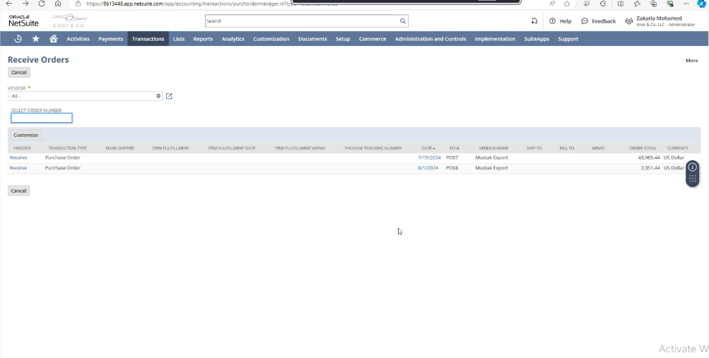 - Displaying the Rug Number in Receive Order: The implementer cannot configure the NetSuite to display the Rug number in Receive Order Record. Because Since Rug Number is an item and the Receive Order record only shows the Purchase order main line information’s.