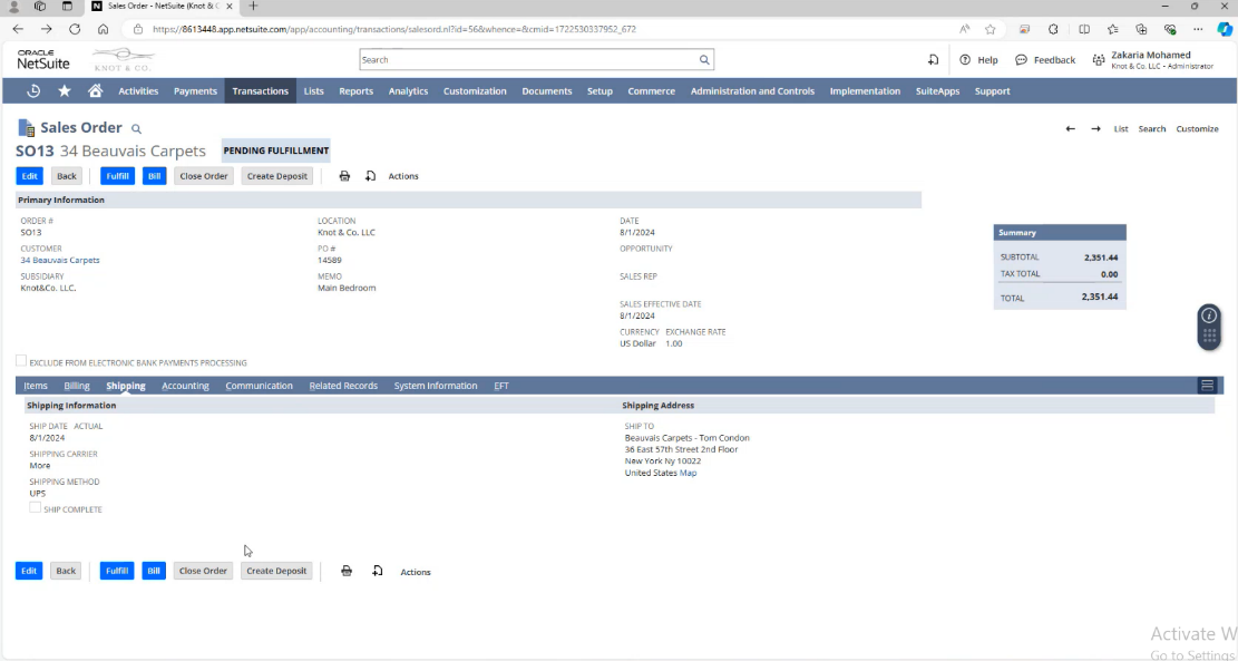 After the items are received and available in inventory, the Sales Order is fulfilled, which includes preparing the items for shipment and generating packing lists. Once the order is fulfilled, an invoice is generated and sent to the customer, reflecting the total cost, including shipping, and any previously recorded deposits. Payments are tracked within NetSuite. Throughout the process, customer and Vendor communications are ensured.