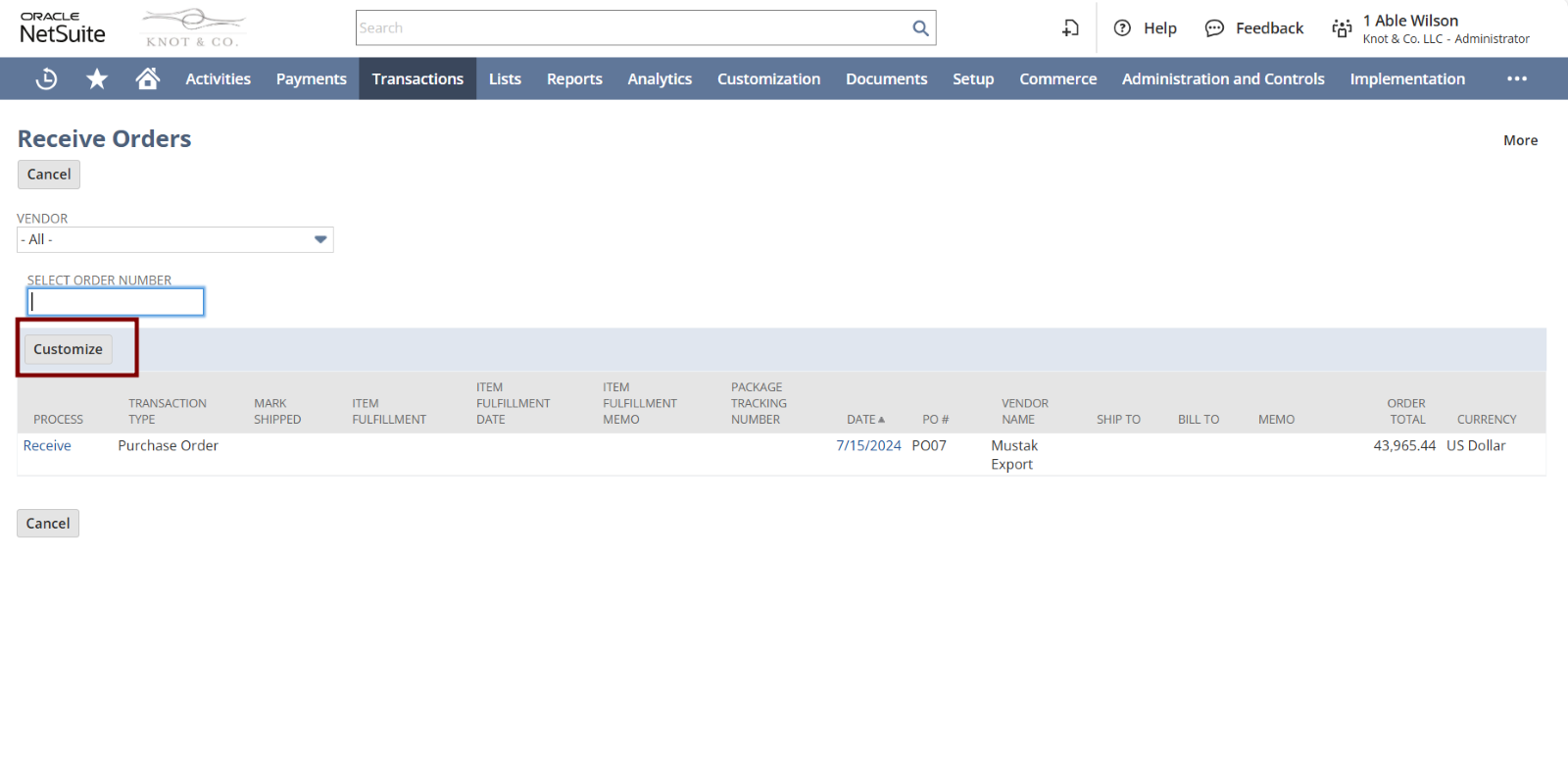 - Sales Order field in Receive Orders: The implementer will add a custom field in the Purchase Order record for defining the associated Sales Order. The implementer will use customize view option to add the Sales Order number associated with purchase order. Further customizations cannot be done on the record, because it is not scriptable. This customization will enhance the traceability of received items, linking them directly to the corresponding Sales Orders. A screenshot has been attached for your reference.