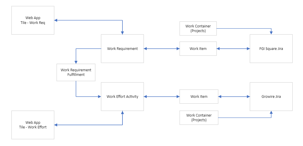 This connection is a single-direction sync from Work Requirement to Work Effort. This functionality was established in the initial phase of development. The existing script creates Work Effort Super Type and Subtype records based on the Work Requirement records. To facilitate the connection between the Work Requirement and Work Effort, a fulfilment record is created.
