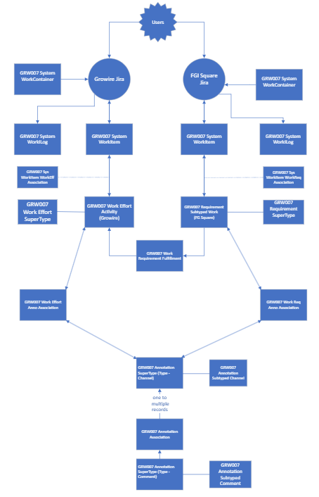 Multiple “GRW007 Annotation SuperType” records labeled as “Comment” along with “GRW007 Annotation Subtyped Comment” records will be associated with the “GRW007 System Work Item” record, reflecting the structure of Jira comments. This phase will consider only the creation and updating of Jira comments, excluding deletion actions.