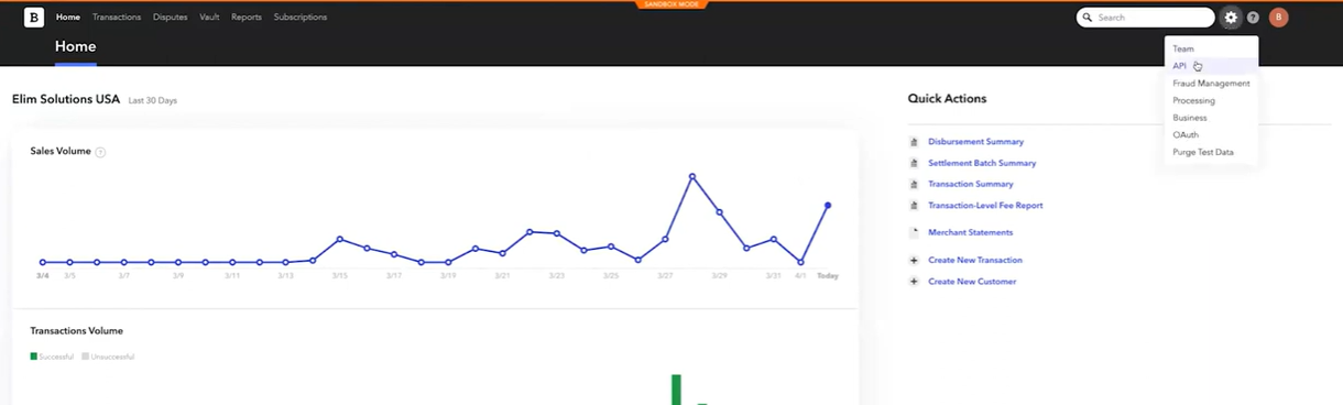 - Log in to braintree merchant account, click on the gear icon and select “API”.