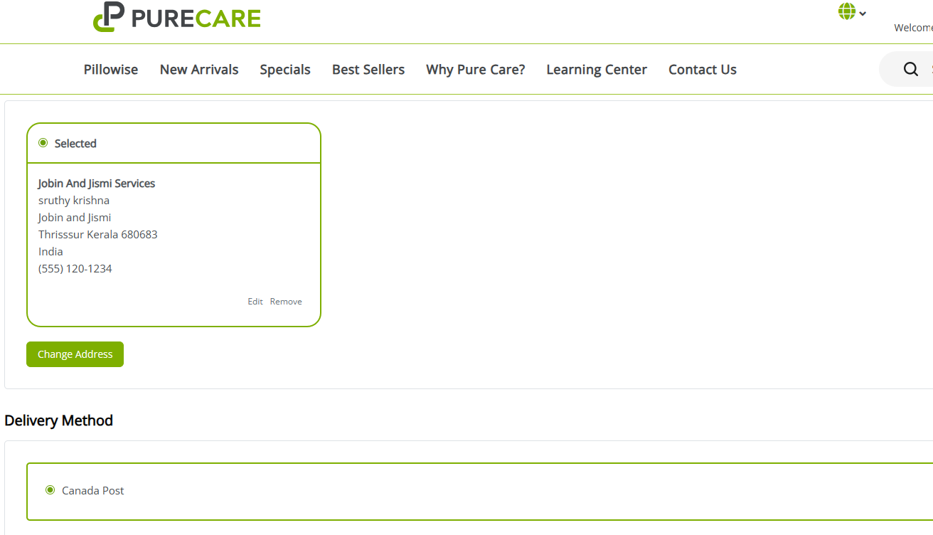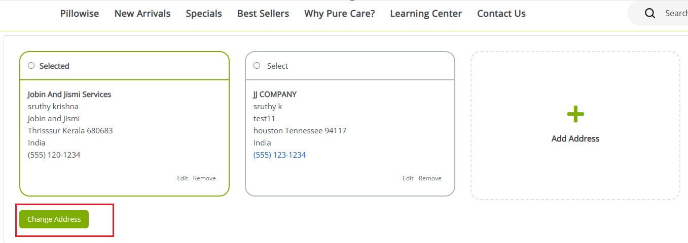 - In case customers need to update their selected address, they can utilize the ‘Change Address’ button, which shows the complete list of addresses linked to their account. Upon making a new selection, only the newly chosen address will be displayed.
