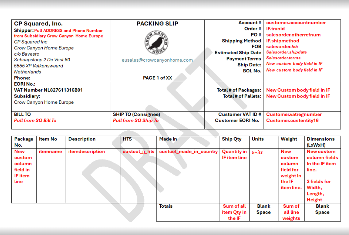 We’ll create two custom forms for the Europe subsidiary: one for Item Fulfillment and another for the Packing Slip. Both forms will be linked to the Europe Sales Order form, ensuring that whenever a new sales order is created using the Europe form, the associated Item Fulfillment and Packing Slip will automatically utilize the Europe forms. Users must select the Europe Sales Order form when creating a sales order for the Europe subsidiary. We’ll also create an Advanced PDF template for the packing slip with the specified layout and field mapping.
