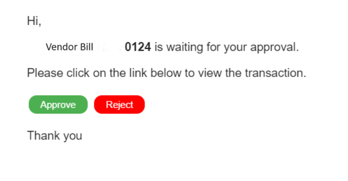 - When Approver clicks the approve link from the email, the related vendor bill or vendor payment shown in the email will be approved in NetSuite and upon clicking the Reject link will reject the vendor bill or vendor payment shown in the email in NetSuite.