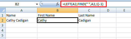 - For the First Name, use the formula =LEFT(A1,FIND(” “,A1,1)-1).