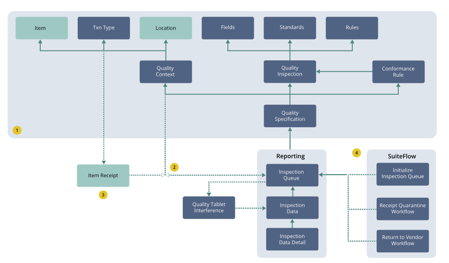 The following diagram depicts the relationship between triggering transactions (item receipt), required inspections, and conformance-driven quality responses that the SuiteApp supports.