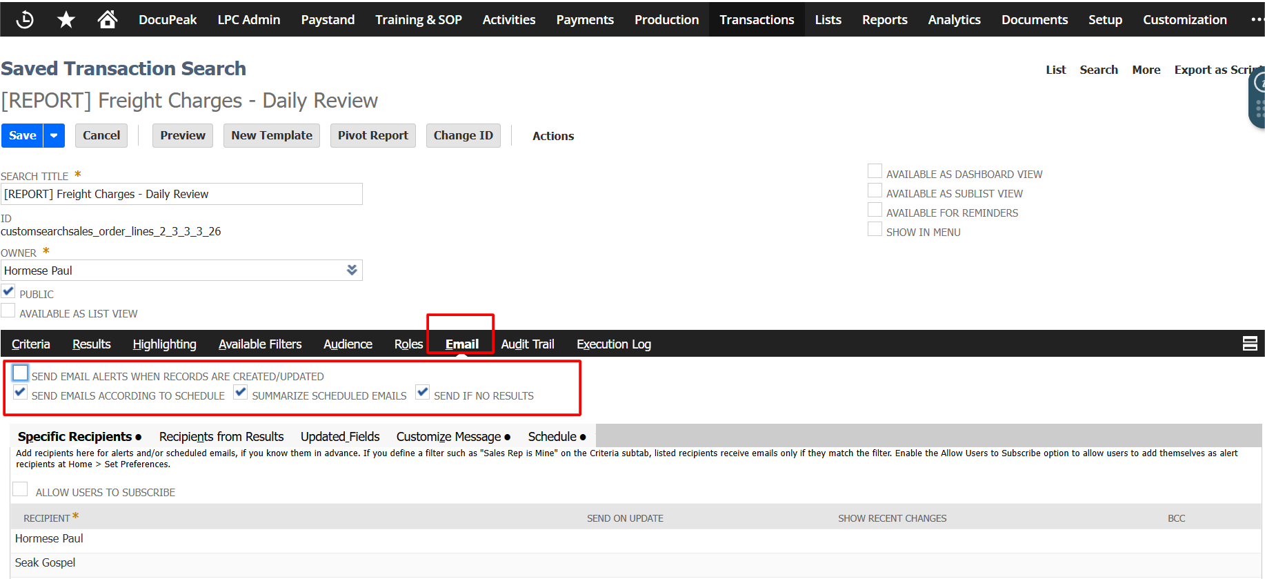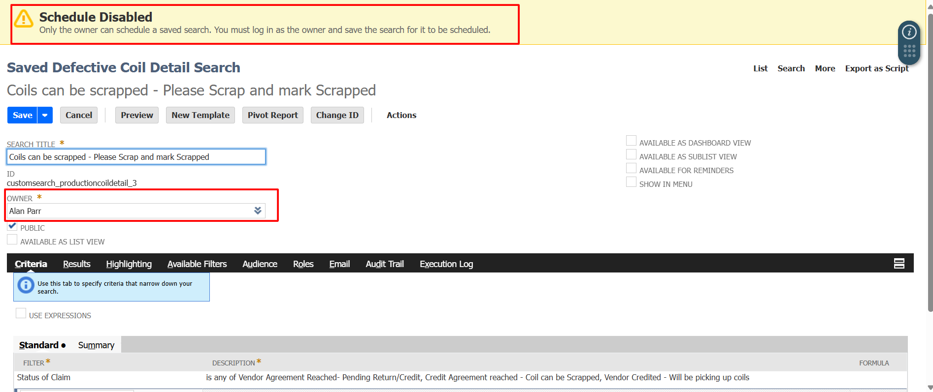 However, if we want to re-schedule the emails, only the owner of the saved search can perform this action. If any other user attempts to do so, the scheduling will not take effect, and an alert message will appear stating: ‘Only the owner can schedule a saved search. You must log in as the owner and save the search for it to be scheduled.