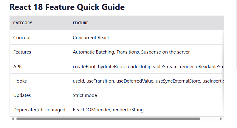 - Concurrent Rendering: Improves performance by allowing React to work on multiple tasks simultaneously without blocking the main thread.