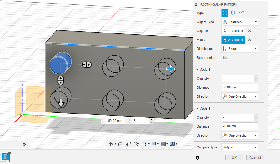 • Now set the quantity to 3 in Axis one , which results in the formation of 3 features along that axis and let the distance be 60 mm in only direction