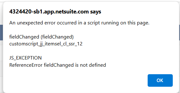 This error indicates that the fieldChanged function, which is supposed to handle field changes in the script, is not recognized or defined within the context in which it is being called. This often happens when the script is not properly loaded or accessible in the environment where it is executed.