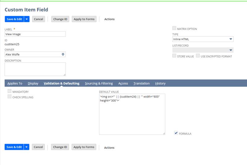 Render image from a hyperlink field to inline HTML field ‘<img src=”‘ || {custitem24} || ‘” width=”600″ height=”300″>’