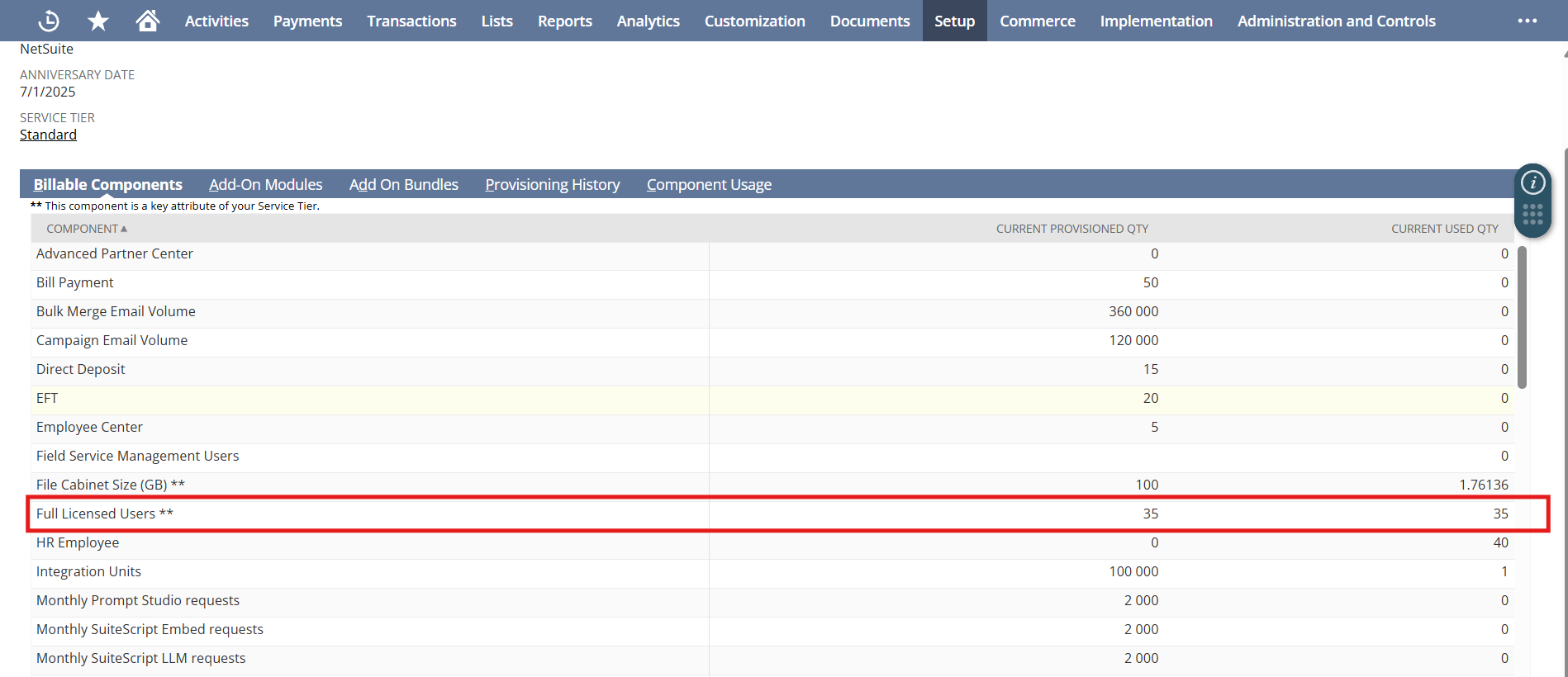 You can verify the current license utilization by navigating to Setup > Company > View Billing Information and checking the count of Full Licensed Users.