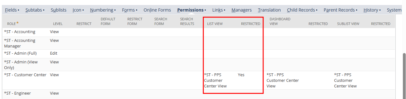 - Next to the List View field, there should be a checkbox labeled “Restricted”. Check this box to enforce the restriction for the selected role.