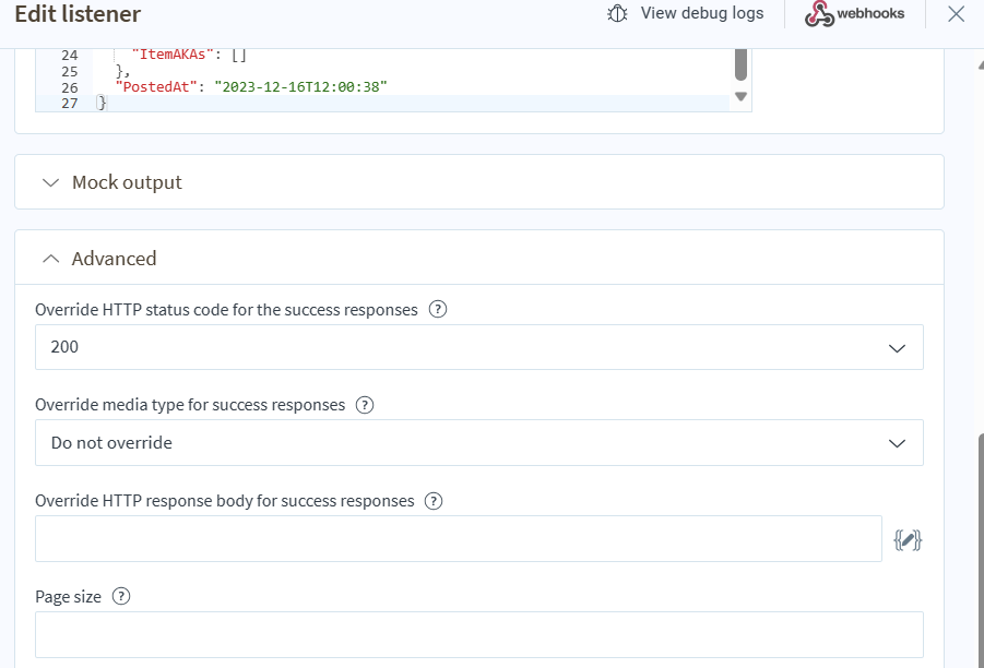 - Click Override HTTP status code for the success responses, the available options are Do not override, 200 and 202.