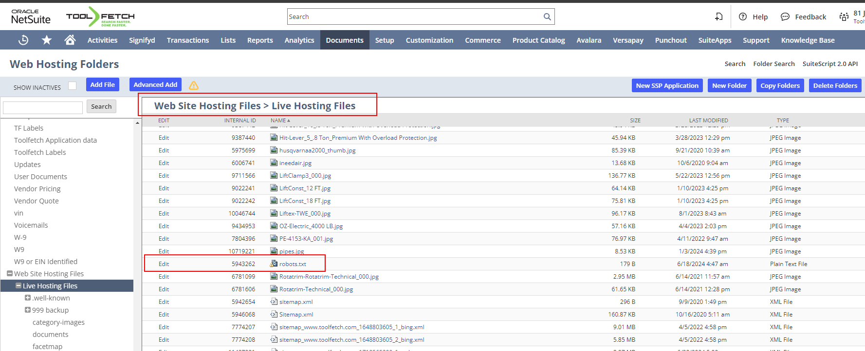 robots.txt file can be found in the NetSuite file cabinet on the Webhosting > Live hosting path
