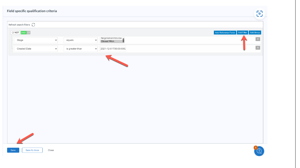 In the “Criteria for Opportunity Sync” on the Salesforce-NetSuite IA (IO), I need to filter out any opportunity that came before 12/01/2021.