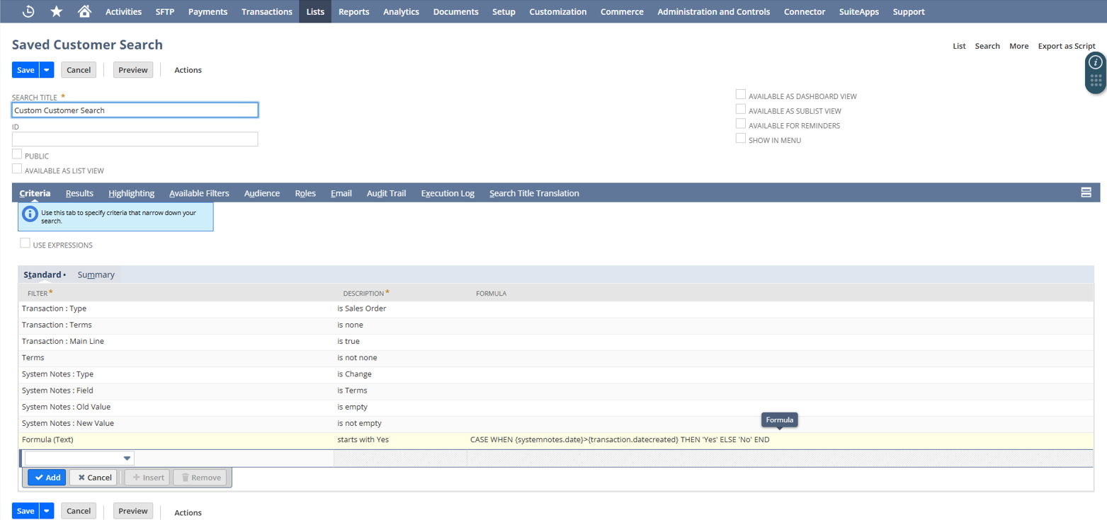 Saved search to find all Sales Order created without ‘Terms’ value but ‘Terms’ was added to related Customer later I created a customer saved search for the same as transaction search was not working properly: