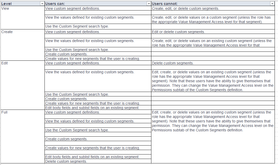 The following table describes the access associated with the various levels of the Custom Segments permission. Except where noted, this table assumes that the user has no other permissions.