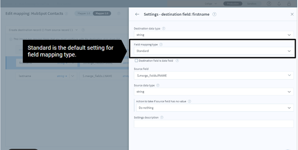 Standard is the default setting for the field mapping type