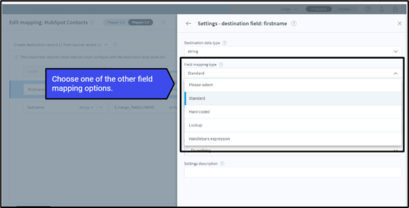 Standard mapping is the default mapping type. You change the field mapping type within the Edit mapping panel for each row. The steps for selecting the mapping type are given below: