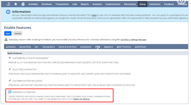 - We need to enable the Marketing Automation feature by navigating to Setup > Company > Enable Features > Under ‘CRM’ Subtab > Enable the ‘Marketing Automation’ feature > Save. During this process, we must accept the Terms of Service for NetSuite Mass E-Mail Messaging Services to proceed.