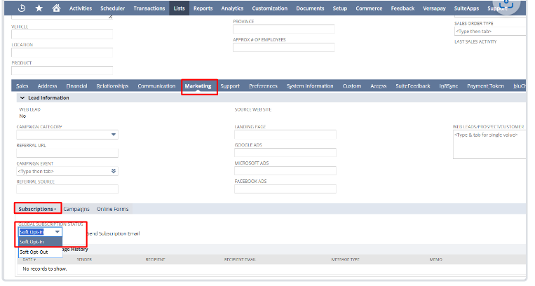 - Next, we need to update the Global Subscription Status of the customers to Soft Opt-In to allow them to receive bulk emails generated through the Mail Merge feature. This can be done manually by navigating to List > Relationships > Customers > Edit > Marketing Subtab and setting the Global Subscription Status or via mass updates.