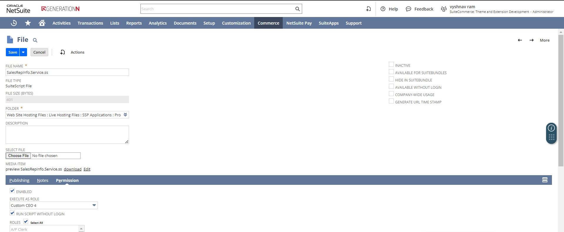 First, our custom extension needs to be deployed and activated to get backend access (backend data) from NetSuite. In order to use the module_name.Service.ss file, it is necessary to assign a matching role in the field ‘Execute as Role’ by editing that .ss file. The ‘CEO’ role or custom CEO role has all the necessary permissions to use and trigger the SuiteScript file.
