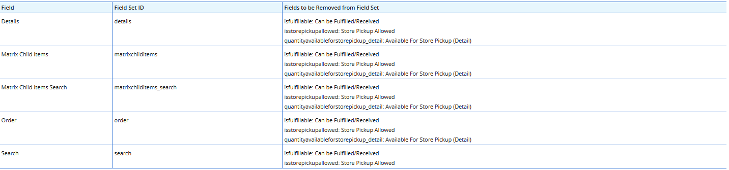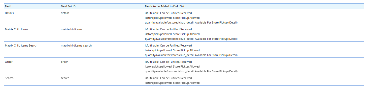 - Add any missing store pickup fields to each field set as defined in the following table.