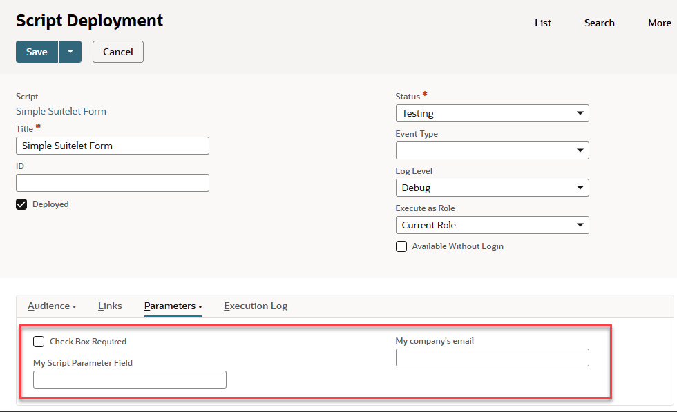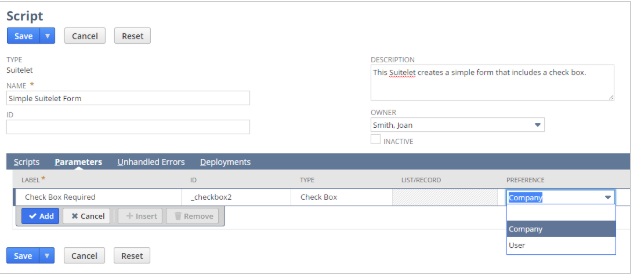 In this example, the Suitelet script includes a parameter called Check Box Required (with the internal ID custscript_checkboxtest2 ) is set to the Company preference.