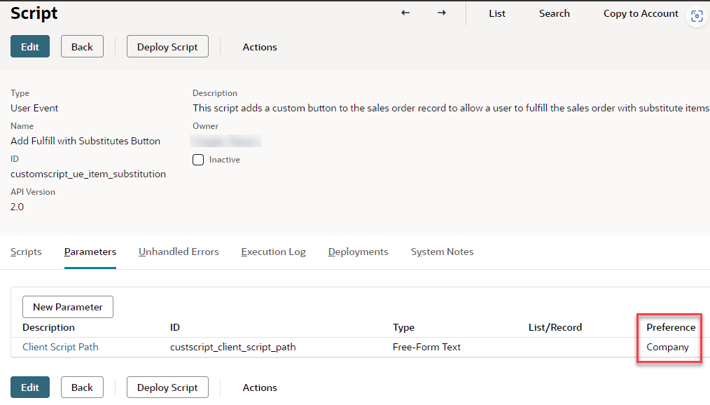 If you don’t set a preference, the script parameter is considered a “deployment” script parameter by default. In this case, you define the value of the script parameter on the Parameters tab of the Script Deployment record.