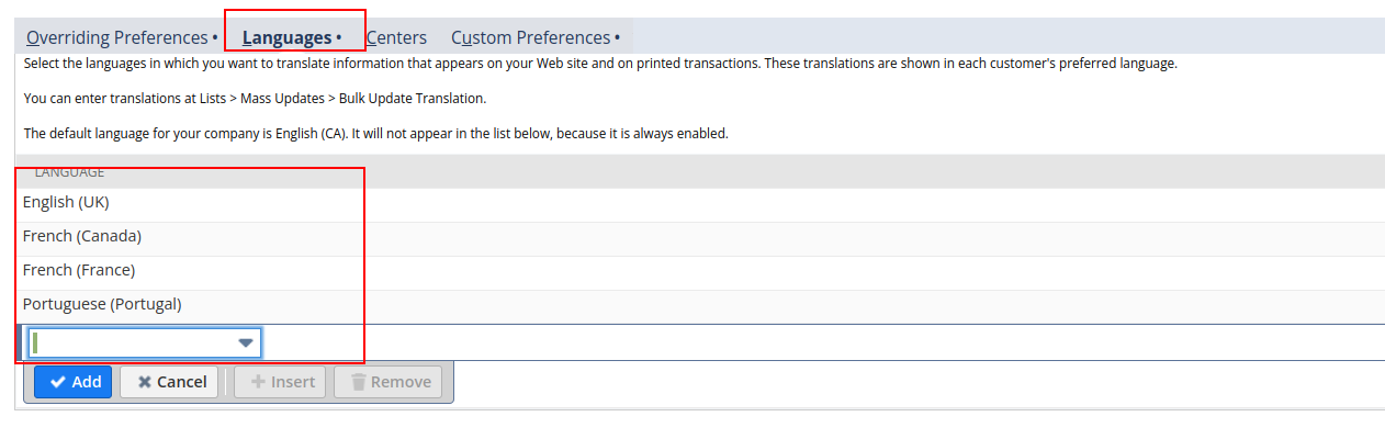 - On the Languages subtab, from the dropdown list, select and add all the preferred languages for our NetSuite account and website.