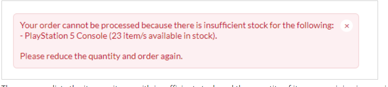 The error message displays on the review page of your Commerce website’s checkout flow if a customer orders a larger quantity of an item than you have in stock. The customer can then edit their order to request a quantity of the item that correlates with the quantity that you have in stock.